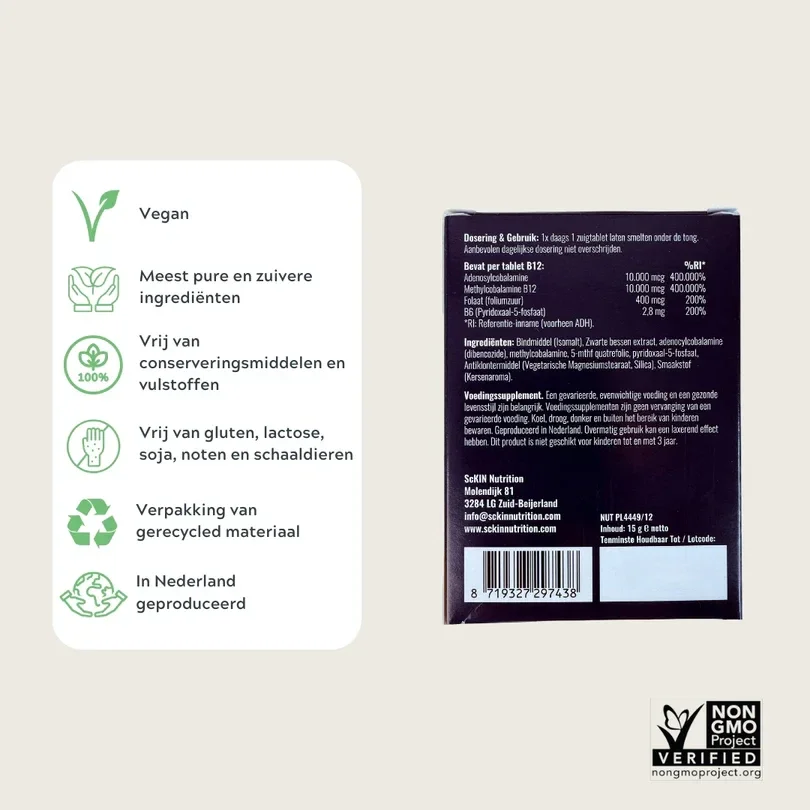 Hoge biologische beschikbaarheid en een sneller effect dankzij actieve vorm van B12 methylcobalamine en adenosylcobalamine. Welkom alternatief voor injecties.