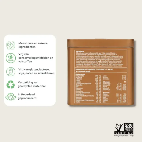 Gehydrolyseerd Marine Collageen Peptide Type 1 (vis), Organisch Banana, D-Glucosamine HCL (vegetarisch), L-Glutamine, L-Lycine HCL, Methylsulfonylmethaan, Calcium-L-Acsorbate, Magnesiumcitraat, Natuurlijke aroma's (Sinaasappel), Natural Rice Concentrate, Bamboe Extract, Curcumine Granulaat, L-Arginine, Chondroïtinesulfaat (Rund Halal), Hyaluronzuur, Papaïne 6000 use u/mg, Rode Alg (Haematococcus Pluvailis), Resveratrol, Quercetine, Lactoferrine (Uit melk), Zinkcitraat, Betacaroteen (Natuurlijk), Zoetstof (Stevia), Amylase 100,000 du/g, Lipase 20.000 FIP, Phytoceramiden (50% Ceramides III), Bromelaïne 2500 gdu/g, Groene Thee Extract (>50% ecgc), Niacinamide, Kopercitraat, Cholecalciferol, Mangaancitraat, Seleniummethionine, Lycopeen, Biotine.